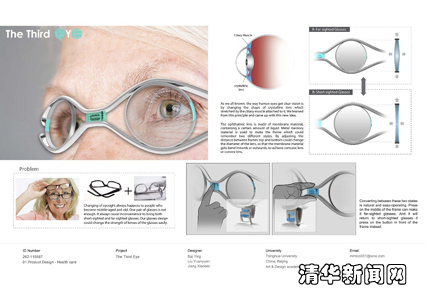 The Third Eye的设计理念是:视力退化是中老年人经常面临的难题,随身携带近视镜和花镜两幅眼镜很不方便。这个眼镜概念设计的独特之处就在于借鉴仿生原理,在一副眼镜上实现近视镜和花镜的便捷转换。我们知道人眼是靠睫状肌牵拉使晶状体变形来调节视力,这个设计正是运用了这个仿生原理。镜片由弹性膜材料包裹液体,镜框为记忆性金属材料,靠改变上下镜框间距来改变镜片直径大小,从而挤压镜片膜材料使之内凹或外凸,形成凹透镜或凸透镜。近视镜和花镜的转换动作简单自然,只要按压上下镜框,就可以调节成花镜。轻轻按眼镜中间的按钮,就可以恢复成近视镜。