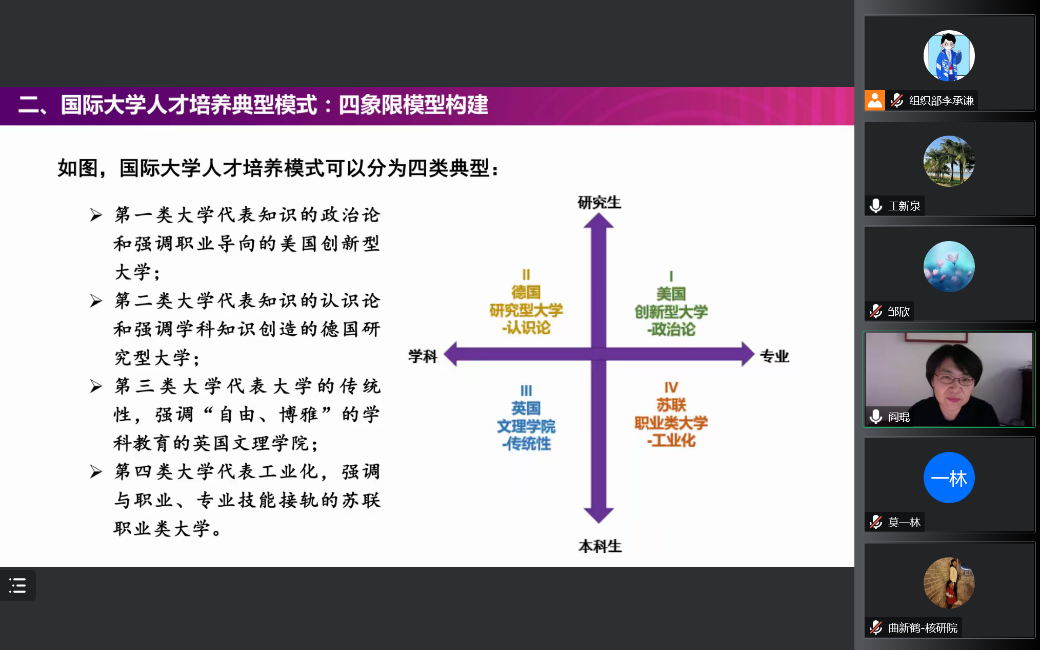 阎琨以“探索扎根中国、融通中外的大学人才培养模式 为科教兴国战略提供全方位人才支撑”为题分享了研究成果,重点介绍了国际大学人才培养模式的四象限理论模型,并分析了四象限模型中各类大学人才培养模式的优劣之处。立足于华体会娱乐平台现有学科和院系及人才培养特色,阎琨详细介绍了华体会娱乐平台学科布局和人才培养的融通战略。最后,她分享到高校应当深入学习领会党的二十大精神,积极贯彻“教育、科技、人才是全面建设社会主义现代化国家的基础性、战略性支撑”的战略擘划,主动开拓和探索人才成长和发展通道,贯通拔尖创新人才培养体系,为我国早日实现全面提高人才培养质量,自主培养各类拔尖人才的伟大目标贡献高等教育的力量。