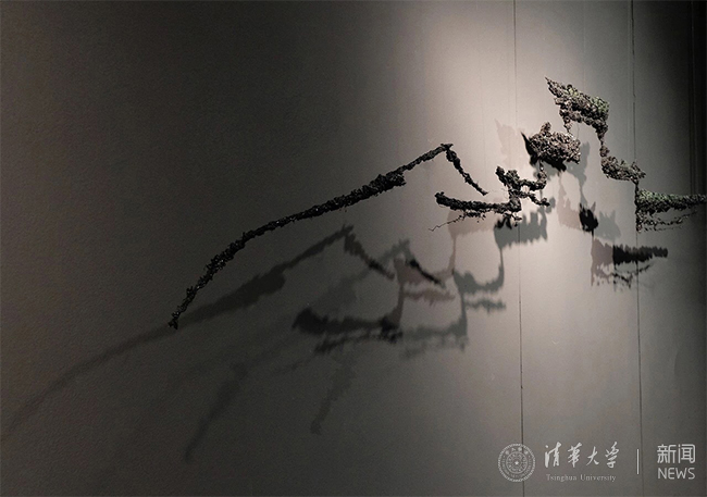 刘烽的雕塑作品《屋脊》汲取传统水墨形式,采用写意手法,焦化的纤维棉在空间中的重构,凝为中国南方传统白墙黑瓦之景。粗糙颗粒的质感借助枯笔泼墨之势在空间中游走。屋脊、兰亭以新的材料语言呈现,让人联想到现如今中国传统文化领地或多或少被人为割裂乃至揉碎,感叹西方文化强势冲撞下的中国文化传统。