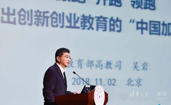 吴岩在会上作了题为“跟跑、并跑、领跑,跑出创新创业教育的‘中国加速度’”的主旨报告,从全面把握新时代要求、全面振兴本科教育,世界和中国的高校创新创业教育实践和跑出创新创业教育的“中国加速度”等方面进行了阐述。吴岩表示,党中央、国务院高度重视高校创新创业教育,要求把创新创业教育贯穿人才培养全过程,因此要加快教育体制改革,注重培养学生的创新精神,加快形成一支规模宏大、富有创新精神、敢于承担风险的创新型人才队伍。他表示,中国的创新创业教育是新时期大学素质教育的新突破,是人才培养模式的新探索,是当代大学生绽放自我、展现风采、服务国家的新平台,是为世界高等教育改革发展贡献的新经验。未来要着力推动创新创业教育与思政教育紧密结合,打造德育大平台;推动创新创业教育与专业教育紧密结合,打造智育大平台;推动创新创业教育与体育紧密结合,打造体育大平台;推动创新创业教育与美育紧密结合,打造美育大平台;推动创新创业教育与劳动教育紧密结合,打造劳育大平台,全力打造双创教育升级版,跑出创新创业教育的“中国加速度”。
