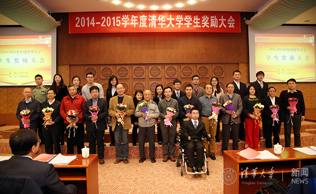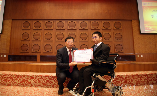 来自计算机系,乐观向上的轮椅少年矣晓沅是此次本科生特等奖学金的获得者之一,轮椅困住了他的身体,却困不住他的梦想。邱勇亲自走下讲台,为坐在台下的矣晓沅颁奖,并赠送他王国维的《人间词话》一书,鼓励热爱诗词艺术的他在书中看到古今诗人的境界,不断提升人生新境界。邱勇表示,矣晓沅自强不息的精神值得所有人学习,“晓沅的轮椅在清华园中行走,是一道靓丽的风景。”邱勇校长还特别送给矣晓沅一束鲜花,希望他将花献给多年来一直默默付出,鼓励支持他的母亲。当矣晓沅把鲜花送给母亲的时候,同学们对这一温情的时刻报以掌声,并纷纷用手机记录下这一感人的场景。