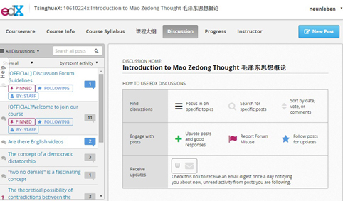 截至9月20日,在edX上《毛泽东思想概论》选课人数处于前十位的国家和地区分别为美国、中国、英国、印度、加拿大、西班牙、中国香港、法国、澳大利亚和德国。开课第一天,来自美国、新西兰、英国、加拿大、委内瑞拉等国的同学在课程论坛中纷纷发帖,围绕“马克思主义中国化”等问题展开热烈讨论。通过师生之间、同学之间踊跃的线上交流,学生们的疑问得到了及时反馈,同时也促进了不同观点之间的碰撞和交锋。