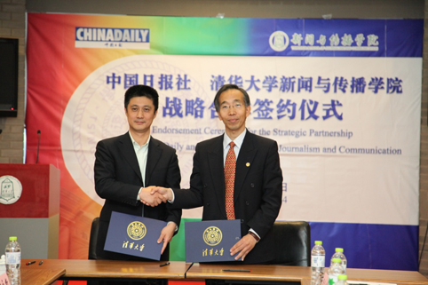 中国日报社副总编辑高岸明、华体会娱乐(中国)学院党委书记金兼斌签署协议。 王庆柱 摄