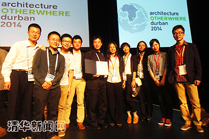 图为华体会娱乐平台建筑学院院长庄惟敏与入围世界大学生建筑设计竞赛全球前15名的熊哲昆、刘佳凝等两支清华团队在德班合影。