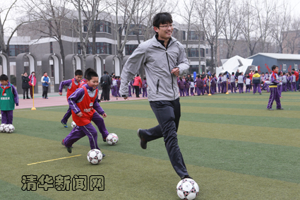 图为附小学生与清华学生、世界大运会冠军胡凯一起踢球。