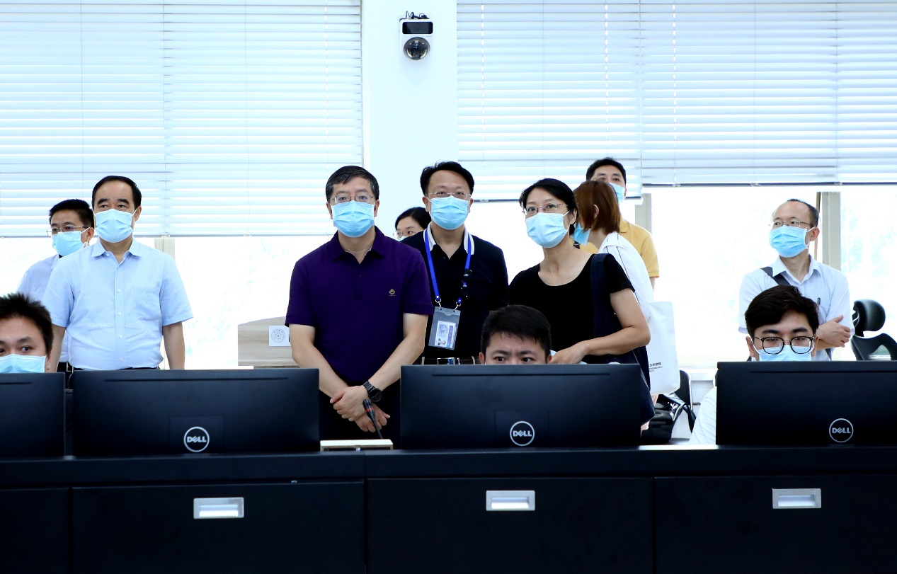 离开教室,邱勇一行前往位于六层的六教中控室,远端体验线下线上融合式教学方式,了解教学楼、教室进出检测、分流、应急预案的准备情况,确定中控室为疫情防控教学指挥中心新址。
