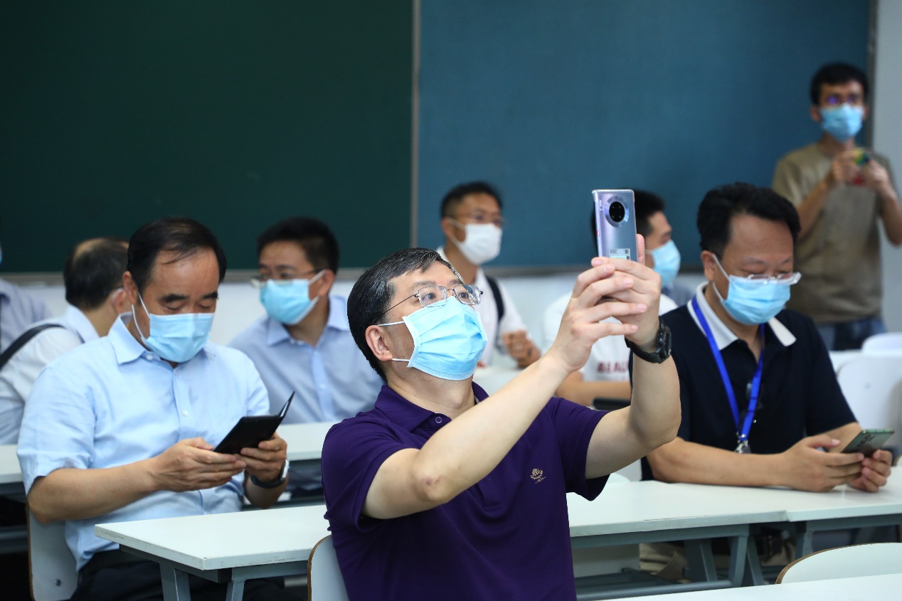 随后,邱勇带队来到第六教学楼检查线下线上融合式教学方式准备情况。在检查教学楼入口的大通量测温设备后,邱勇一行来到6B211教室体验线下线上融合式教学。
