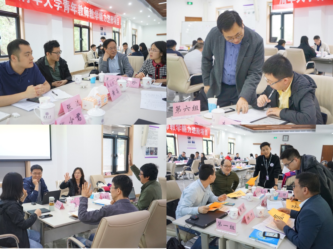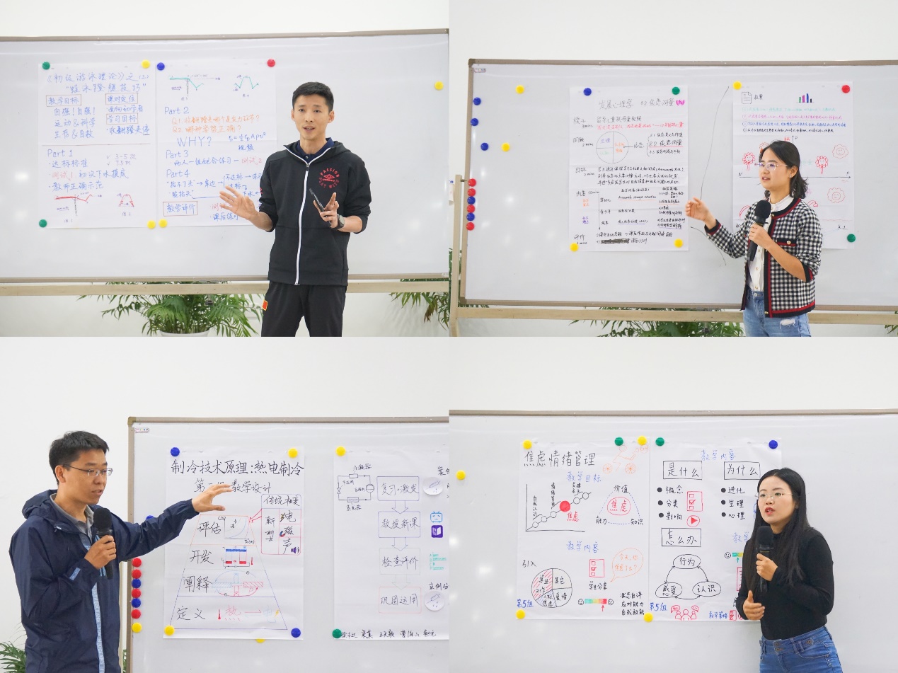 晚间,参加本次教学能力进阶项目的教师按照7个小组,结合自身讲授的课程以及教学设计的方法和流程,开展了跨学科的头脑风暴式讨论。小组成员从各自不同学科角度出发,共同探讨、商定,进行了一节课的教学设计,并在16日上午对教学设计的成果进行展示。各小组的课程既包含专业核心课,也有通识课、公共体育课,呈现了“混合现实技术(MR)”“焦虑情绪管理”“伯努力方程及应用”“制冷技术原理:热电制冷”“《初级游泳理论》之三‘蛙泳蹬腿技巧’”“量子检测”“发展心理学—依恋测量”等精彩的教学设计。在郑力、王水弟、田静和李斌锋的指导点评下,教师们也针对教学内容、教学目标、教学策略和教学评价设计等环节进行了充分讨论。