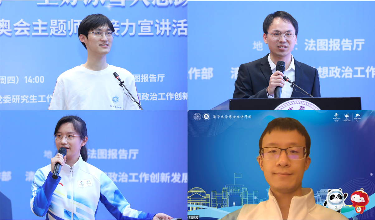北京冬奥校内保障志愿者、马克思主义学院2021级硕士生陈炳旭以“同筑冰雪梦,一起向未来”为题,解读了习近平总书记关于北京冬奥的重要论述。北京冬奥火炬台设计团队成员、机械系2017级博士生李新新讲述了参与马赛教授、田煜教授、石永久教授团队设计冬奥火炬台的故事。北京冬奥OFA志愿者、环境学院2020级博士生刘迪波分享了参与外宾接待、搭建中外沟通的桥梁的亲身经历。北京冬奥标兵志愿者、精仪系2018级本科生李金峰分享了参与开闭幕式演出、展示中国青年风采的经历。