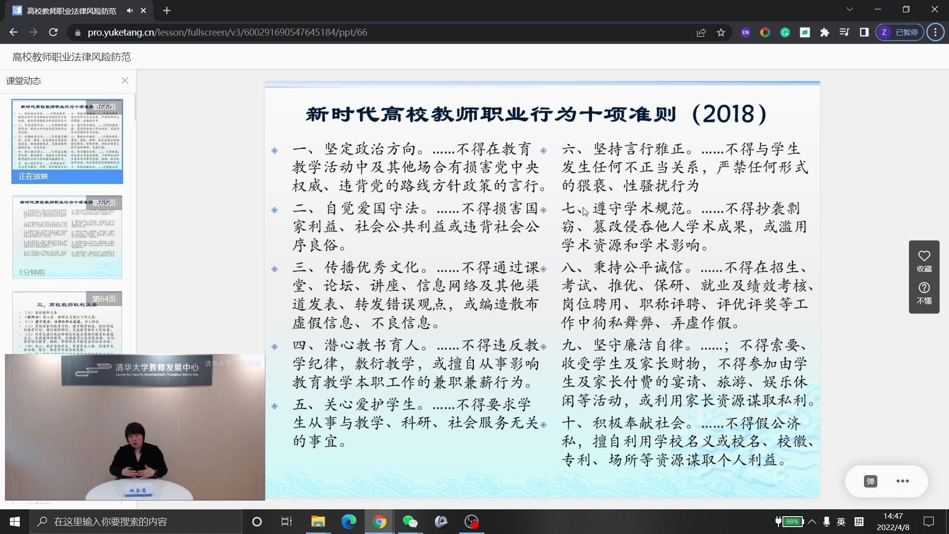 华体会娱乐(中国)网4月12日电 4月8日下午,由华体会娱乐平台教师发展中心举办的高校教师职业法律风险防范讲座通过荷塘雨课堂在线举行,北京外国语大学人事处副处长、中外教育法研究中心主任姚金菊教授基于多年来从事教育法研究及教育管理的实践经验,结合华体会娱乐平台教书育人的优良传统,对高校教师法律地位、资格制度及权利义务进行了深入浅出地解读,帮助教师依法明事、护身、爱生、执教。来自全校各单位共148名青年教师参加活动。