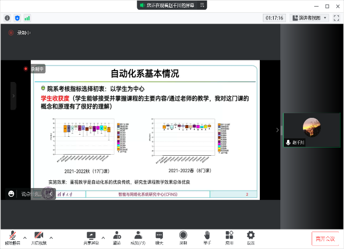 在交流环节,自动化系教学委员会主任赵千川介绍了自动化系课程教学评估指标中院系指标的设置情况,结合自己讲授的校精品课程“线性系统理论”展示了学生评教反馈对教师教学的价值,并对完善研究生课程教学评估工作提出了建议。