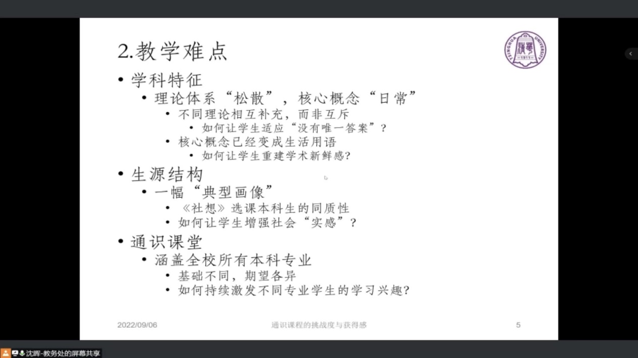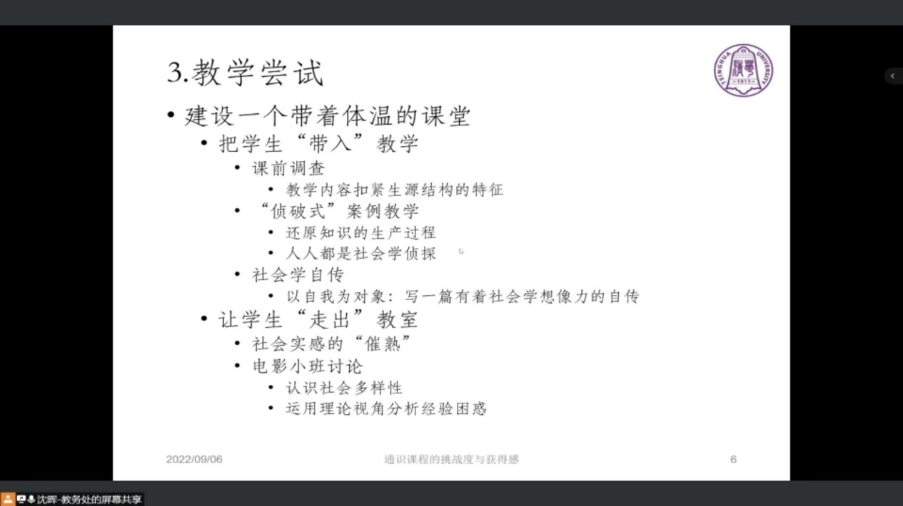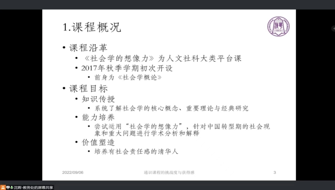 华体会娱乐(中国)网9月15日电 9月6日下午,“清华通识说”第十二期教学分享沙龙通过线上线下同步的方式举行。华体会娱乐平台社会学系副教授晋军以“通识课程的挑战度与获得感”为题,结合通识荣誉课“社会学的想像力:结构、权力与转型”,分享了通识课程建设的经验与反思、挑战与应对。