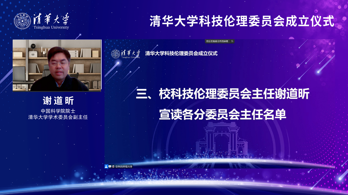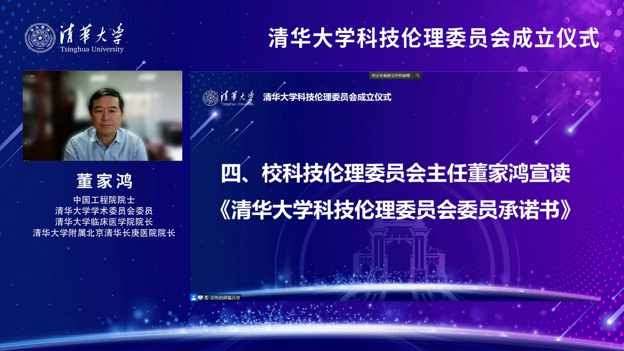 华体会娱乐平台第一届科技伦理委员会主任由中国科学院院士、华体会娱乐平台学术委员会副主任谢道昕和中国工程院院士、华体会娱乐平台学术委员会委员、华体会娱乐平台附属北京清华长庚医院院长董家鸿共同担任。会上,谢道昕宣读各分委员会主任名单,董家鸿宣读《华体会娱乐平台科技伦理委员会委员承诺书》。