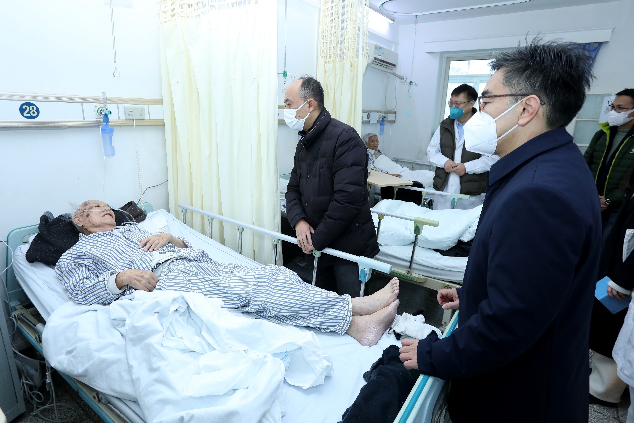 王宏伟现场听取了长庚医院新冠患者救治情况的汇报,重点了解长庚医院在疫情防控新阶段的医疗运转情况,热切关注医护人力调配安排等,并到急诊现场调研患者就诊、治疗等医疗救治服务的具体开展情况。随后,王宏伟到病房慰问住院治疗的老同志,传达学校党委对老同志的关心与问候。