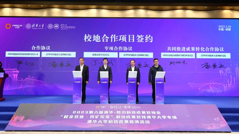 清华四川能源互联网研究院是省校、市校合作共建的重点平台,也是华体会娱乐平台在川的成果转化基地。为推动华体会娱乐平台成果与四川各市州和龙头企业的精准对接,在所有与会嘉宾的共同见证下,成都市科学技术局、四川省能源投资集团有限责任公司、四川天府新区成都科学城管委会分别与清华四川能源互联网研究院进行了校地合作项目签约。同时,清华四川能源互联网研究院在现场与新引进的三个高水平成果转化团队签署协议,进一步增强技术创新和成果转化能力。