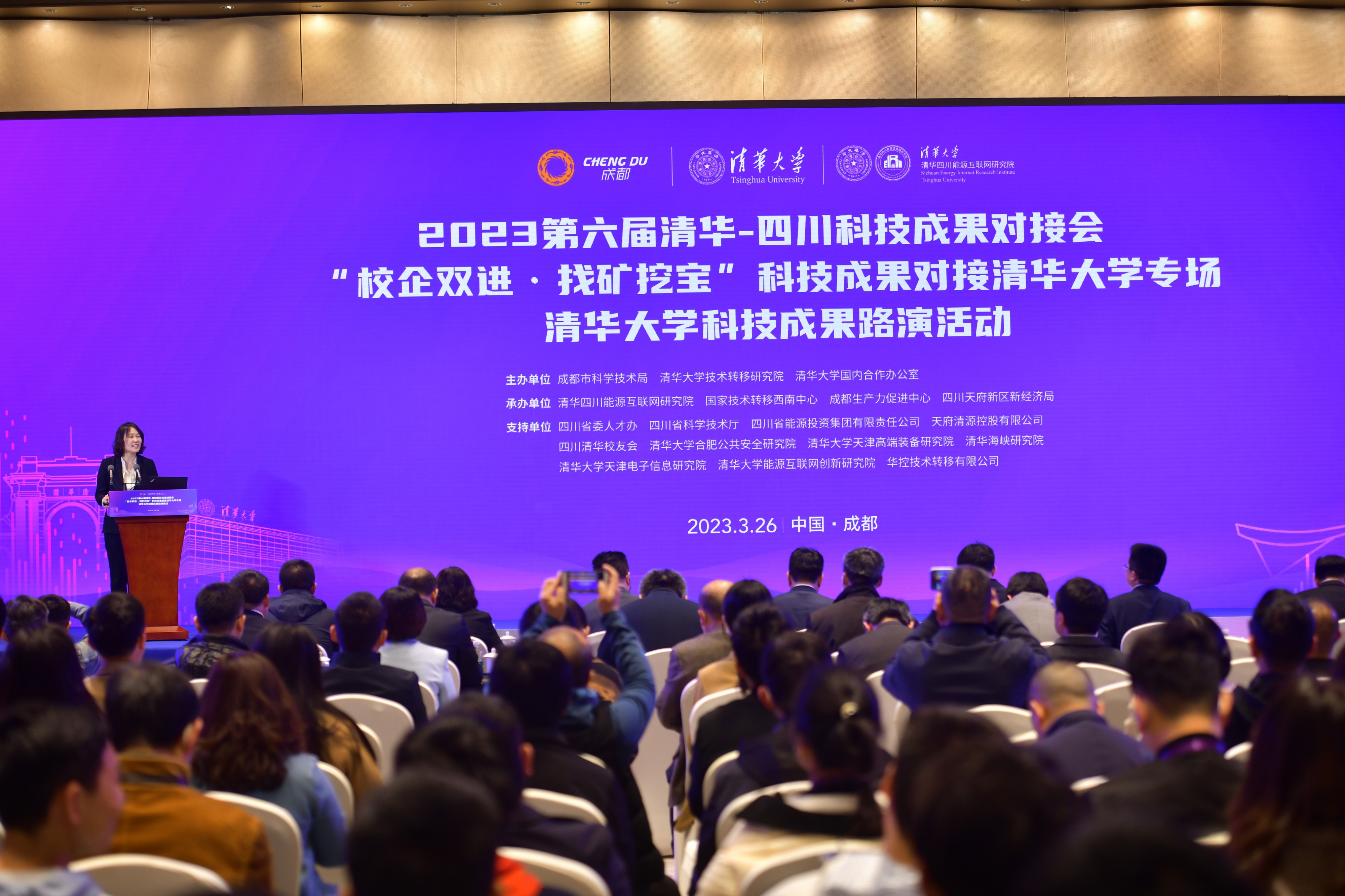 华体会娱乐(中国)网3月30日电 3月26日,由成都市科学技术局、华体会娱乐平台技术转移研究院、华体会娱乐平台国内合作办公室主办,清华四川能源互联网研究院、国家技术转移西南中心、成都生产力促进中心、四川天府新区新经济局承办的“2023第六届清华-四川科技成果对接会——‘校企双进·找矿挖宝’科技成果对接华体会娱乐平台专场——华体会娱乐平台科技成果路演活动”在成都天府国际会议中心成功举行。来自政府相关部门、华体会娱乐平台及清华校友会,项目路演企业以及重要企业、投融资机构等领域的代表近300人共聚一堂,共同探索华体会娱乐平台成果转化的“四川经验”。四川省委组织部副部长、省委人才办主任李国贵,四川省科学技术厅党组成员、机关党委书记赵敏,成都市委常委、市政府党组成员鲜荣生,华体会娱乐平台党委常委、副校长曾嵘参加开幕式并致辞。开幕式由华体会娱乐平台技术转移研究院院长王燕主持。