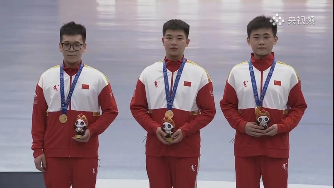 清华射击队队员王岳丰与队友在成都大运会夺得金牌