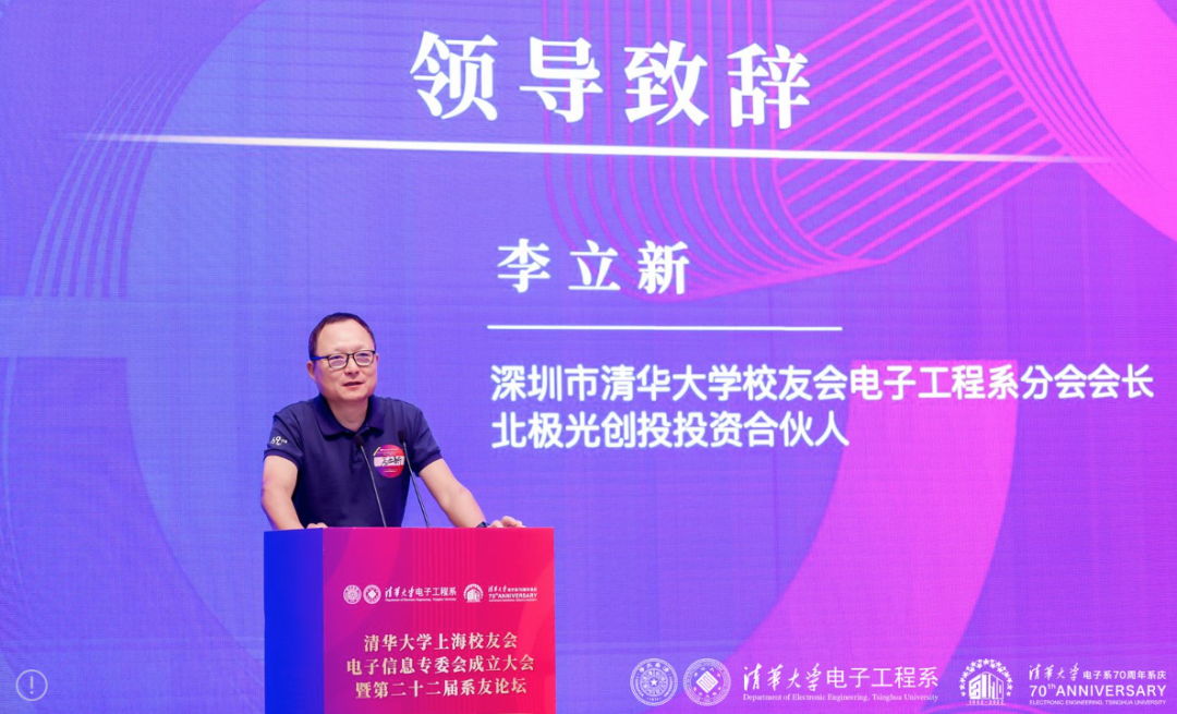 深圳市华体会娱乐平台校友会电子工程系分会会长、北极光创投投资合伙人李立新代表清华深圳校友会电子工程系分会祝贺上海校友会电子信息专会的成立。