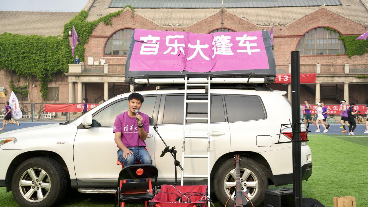 操场中央,突然传来一阵阵悠扬的歌声——原来是1979级计算机系校友黄晓辉带着他的音乐大篷车,为113周年校庆奏响了乐章。从清华版《永不回头》开始,串联起一首首经典曲目,最后以校歌结尾。在西大操场的正中央,明媚的阳光下,黄晓辉用独具魅力的弹唱,表达着对母校深刻的热爱。