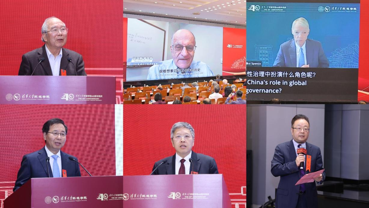 郝吉明主持论坛报告环节,托马斯·萨金特和迈克尔·斯宾塞作特邀报告,曲久辉和王金南作引导报告,贺克斌主持讨论环节(从上至下,从左至右)