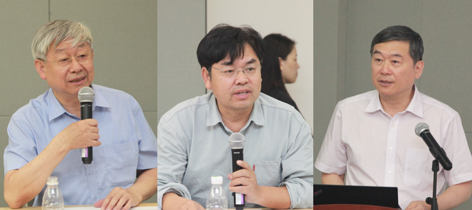 聂建国发言,谢道昕主持会议,董家鸿作工作汇报(从左至右)