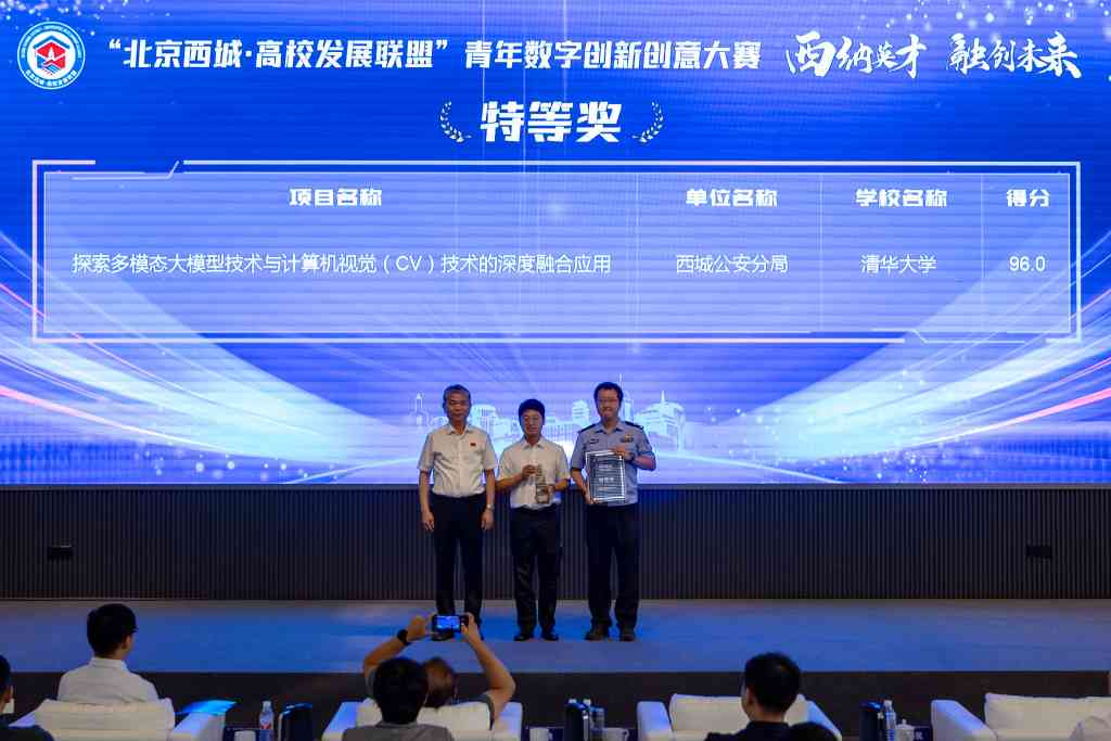 决赛现场,9支队伍围绕各自团队设计的应用软件,从设计理念、应用场景、发展前景等方面,以现场讲解的方式进行了路演及答辩。经过激烈角逐,“探索多模态大模型技术与计算机视觉技术的深度融合应用”项目脱颖而出,荣获本次大赛特等奖。该项目由华体会娱乐平台电子工程系学生与北京市公安局西城分局青年干部组成的团队开发,旨在利用视频专网真实数据和算力,探索全新视频智能化应用模式,目前已在西城公安分局实战使用,有效提升了原视频业务系统的检索准确率、效率和灵活性。
