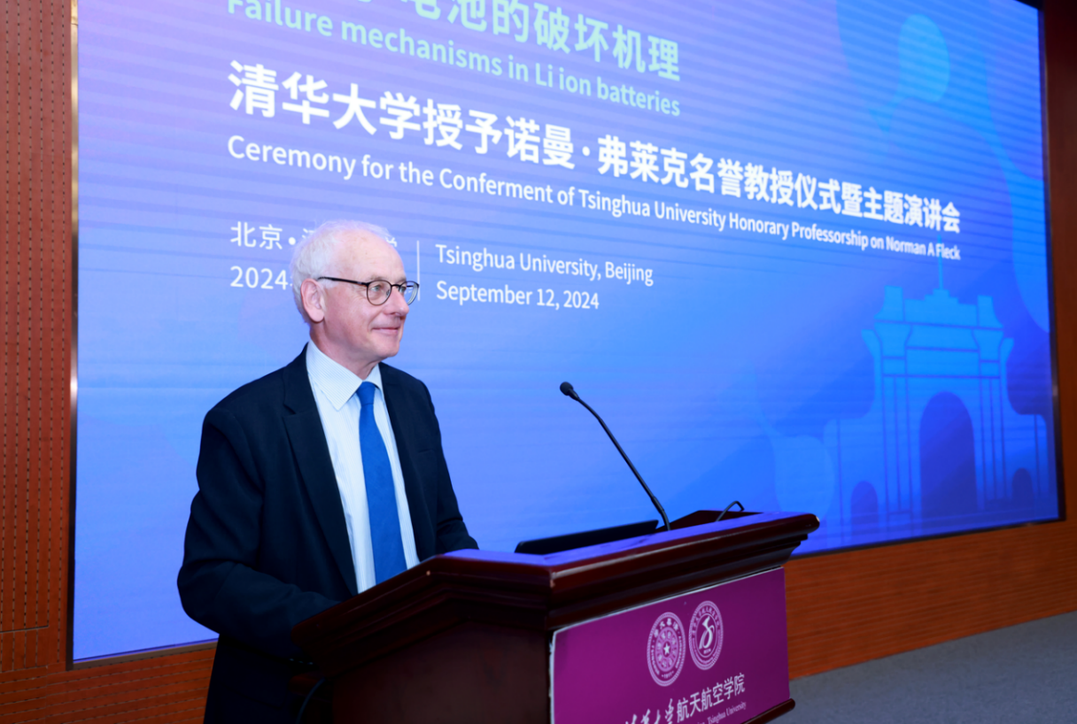 当天的清华海外名师讲堂中,诺曼·弗莱克首先介绍了锂离子电池的发展历史和基本原理,并深入探讨了当前锂电池技术所面临的关键问题。随后,他通过电力耦合的变分方法详细介绍了固体电解质中的枝晶生长现象;结合理论分析、模拟与实验数据,深入解析了单晶电极在锂化与脱锂过程中的行为;讲述了快充过程中电极裂纹生长的建模与分析。工程力学系主任陈常青主持活动。