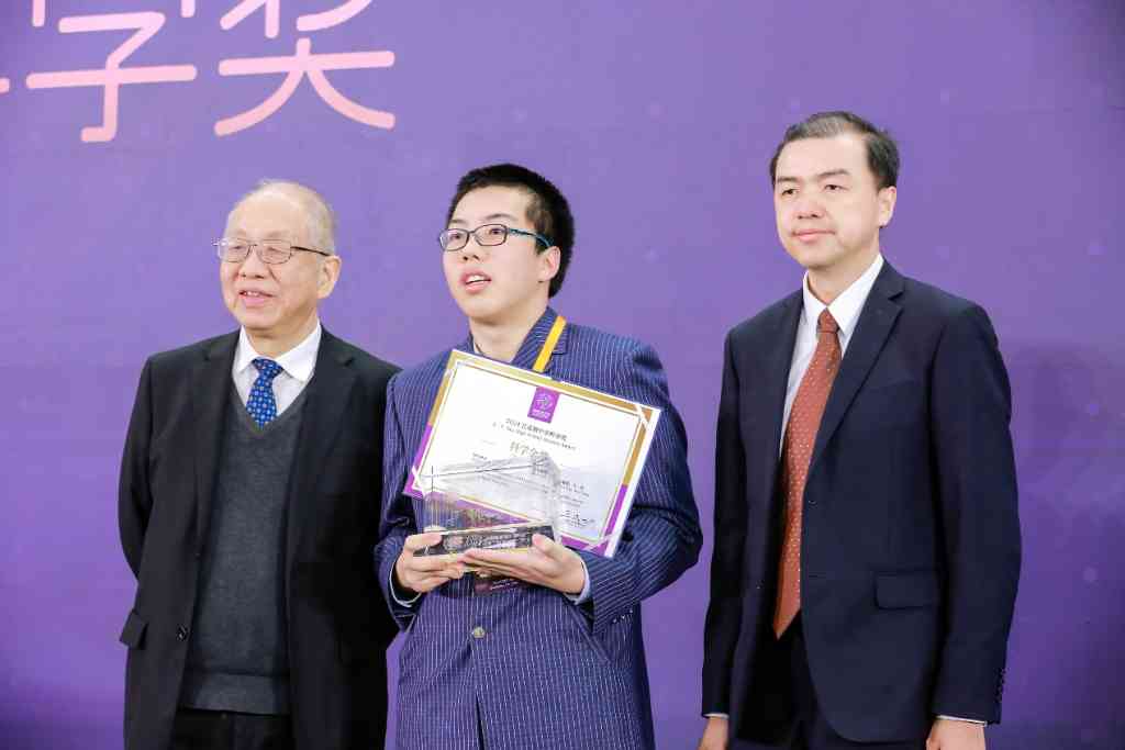 丘成桐(左一)、向波涛(右一)为科学金奖得主刘广羽颁奖