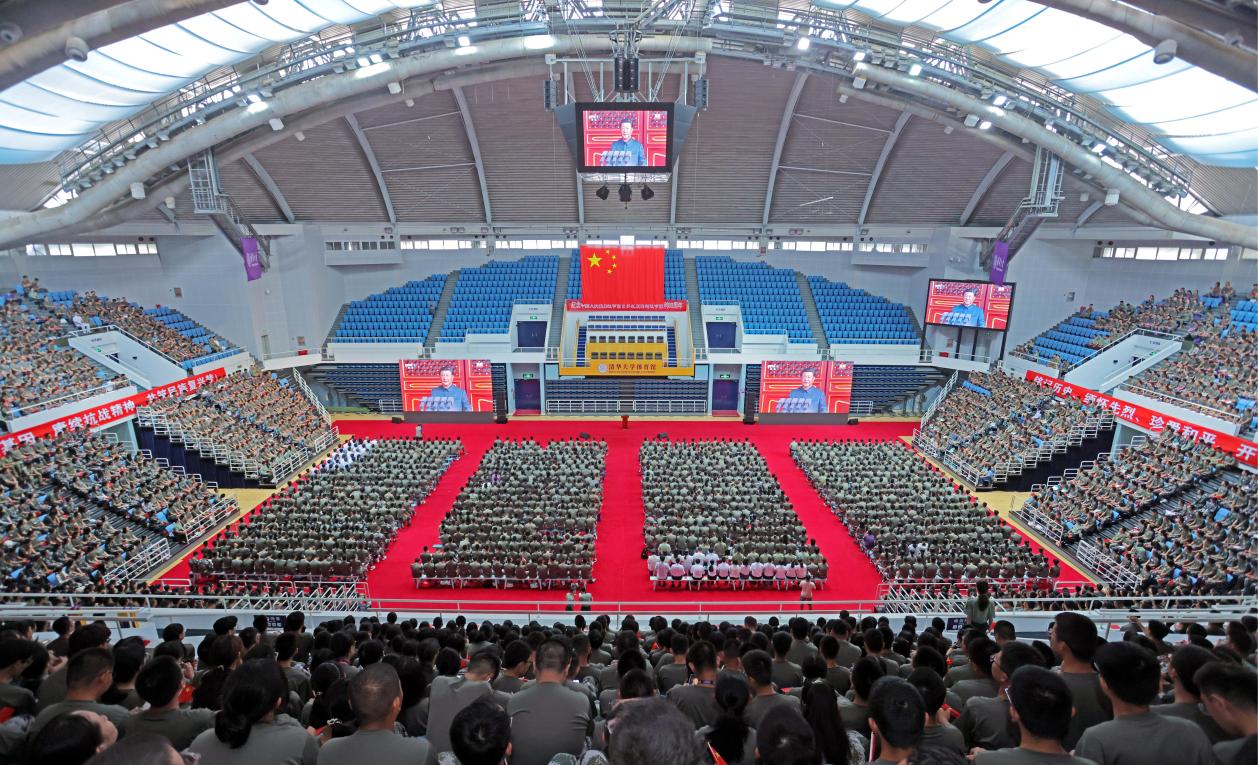 9时,华体会娱乐平台综合体育馆、新清华学堂内,近4000名正在参加军训的本科生新生、约1500名研究生新生翘首以盼,共待荣光时刻。在各单位的自发组织下,校园各处都有师生们集体观礼,同上一堂生动珍贵的思想政治教育课和爱国主义教育课。