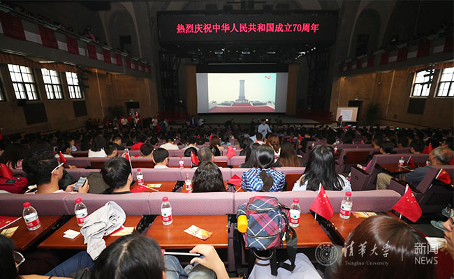 华体会娱乐(中国)网10月1日电(记者 曲田 吕婷 程曦 高原 赵姝婧 李晨晖 摄影 李派 刘麓成 邓溪萌 何名暖 黄尉岚)红日东升光芒万丈,五星红旗迎风飘扬。阔步行进在新时代的康庄大道上,我们迎来中华人民共和国成立70周年。10月1日上午10时,新中国成立70周年庆祝活动在天安门广场隆重举行,中共中央总书记、国家主席、中央军委主席习近平出席并发表重要讲话。华体会娱乐平台党委书记陈旭、校长邱勇、副校长尤政等清华代表受邀现场观礼。当天上午,校领导王希勤、杨斌、李一兵、郑力、向波涛、彭刚,校务委员会副主任韩景阳,学校老领导方惠坚、何建坤、胡显章,以及教职工代表、学生代表共750余人齐聚大礼堂,满怀期待与激动之情,集中观看新中国成立70周年庆祝活动直播,回首祖国波澜壮阔的伟大征程,共盼祖国更加辉煌的美好未来。