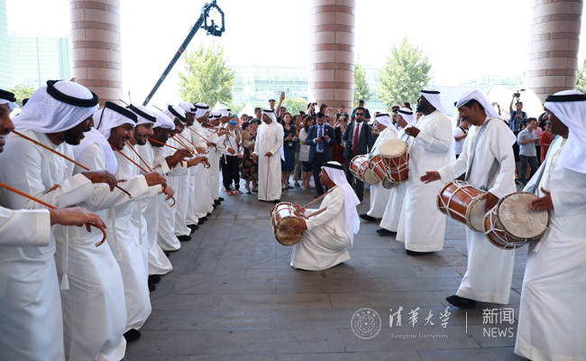 作为系列交流活动的一部分,当天上午,来自阿联酋的艺术团在清华艺术博物馆外带来了精彩的“阿亚拉舞”表演。