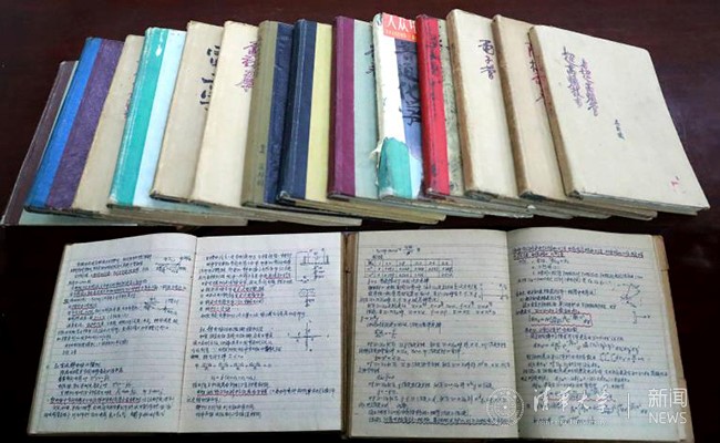 吴邦国校友此次捐赠的笔记共14本,都是大学期间学习各门课程的课堂笔记,包括《电工学》《电动力学》《阴极电子学》《电子光学》《普通化学》《超高频技术与超高频管》《热力学统计物理真空技术》《函数逼近》《汽体放电与离子管》《物理》等各一本,《电子管》《电子线路》各两本,涵盖了12门课程。笔记均为硬皮横格笔记本,封面或扉页上写着课程名称,并清晰记载了授课时间、授课地点、授课老师和学习情况,都用墨蓝色钢笔书写,有的地方还用红笔画线标注出重点难点等。大部分笔记都用牛皮纸包了皮,其中一本是用当年非常流行的《大众电影》杂志封面纸包了皮,由于经常翻阅,有的书皮折叠处慢慢碎裂,他还剪了旧报纸在封皮里面粘住,将整个书皮固定,生动地反映了他当年对笔记本的爱护和珍惜。每本笔记字迹整洁,清晰明了,体现了吴邦国学长严肃认真、一丝不苟的学习态度。