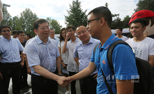 邱勇一行首先来到位于综合体育馆西侧的网球场院系迎新区,先后到数理类、能源类、机械航空与动力类、化生类、土木类、文理通识类迎新点,看望报到新生与迎新工作人员。在数理类迎新点,邱勇向院系老师仔细了解大类招生后的培养工作变化,鼓励新生在清华追逐自己的梦想。在机械、航空与动力类,邱勇鼓励新同学未来选择自己真正感兴趣的专业,把握大学时光,不断提升自己。
