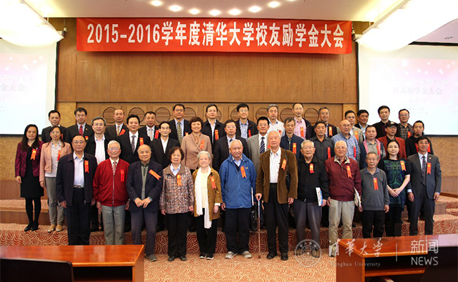 2016年校友励学金大会与会校领导和校友合影。