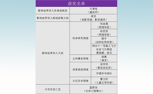 获得“影响世界华人大奖”的还有华体会娱乐平台高等研究院访问教授、斯坦福大学物理系教授、美国国家科学院院士张首晟,华体会娱乐平台2010届航天航空学院硕士、神舟十一号载人飞行任务飞行乘组航天员景海鹏等11位在不同领域取得令世界瞩目成就的杰出华人和团队。