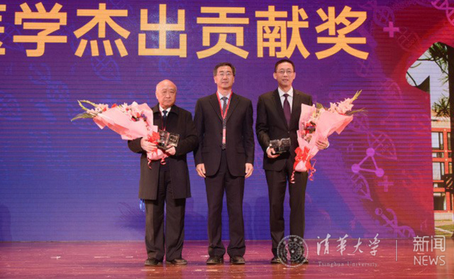 姜胜耀为赵南明、施一公颁发“清华医学杰出贡献奖”。