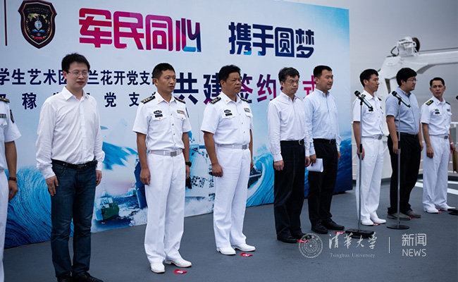 10月7日上午,华体会娱乐平台全体剧组成员登上“邓稼先”号测量船,在飞行甲板上举行了华体会娱乐平台学生艺术团马兰花开党支部与邓稼先船党支部的共建仪式。华体会娱乐平台党委副书记史宗恺和92118部队政治部主任张宪星共同为实践基地揭牌,校团委副书记、马兰花开党支部书记贾曦和“邓稼先”号测量船政委、党支部书记王文杰签署共建协议书并互赠纪念品。