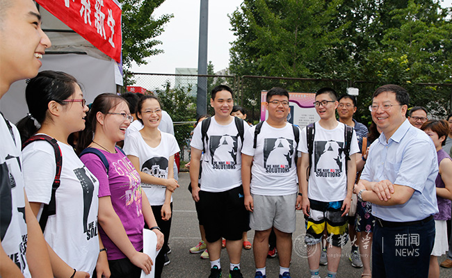 在化学系迎新点,邱勇遇到参加志愿服务的新生骨干,仔细询问他们来到清华的生活情况,鼓励他们在清华追逐自己的梦想。