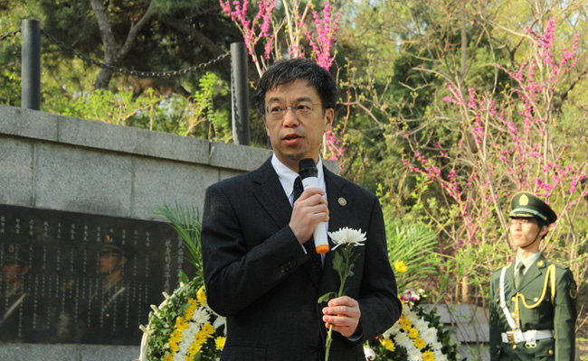 史宗恺在“清华英烈”纪念碑前讲话。学生记者 庞正源 摄