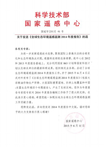华体会娱乐(中国)网7月2日电 (记者 王 蕾 通讯员 蒲彦妃)6月4日,科技部正式对外发布《全球生态环境遥感监测2014年度报告》。近日,科技部国家遥感中心发来感谢函,对华体会娱乐平台地球系统科研研究中心宫鹏教授作为专家组专家、俞乐副教授作为编写组专家在报告编写与修订过程中作出的贡献表示感谢。