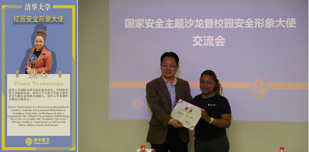 从在校学生和校友中选择具有一定影响力的同学,让他们担任校园安全形象大使,发挥他们自身“领袖人物”的引领作用,吸引同学们关注校园安全,这是保卫处近年来持续在做的事情。来自津巴布韦的裴心(Diana Nyakatsapa)是首位被推选为校园安全形象大使的国际学生,她用自己灿烂的笑容温暖着每一个人。平日里,裴心代表国际学生参加校园安全活动,将国际学生需要的安全信息和资源传递给每一个人。她表示:“参与保卫处的工作是一次神奇的经历,是拓展视野的绝佳机会。在这些工作中,我不仅了解了校园的安全措施,还结识了很多优秀的朋友,发展了自己的领导力。”