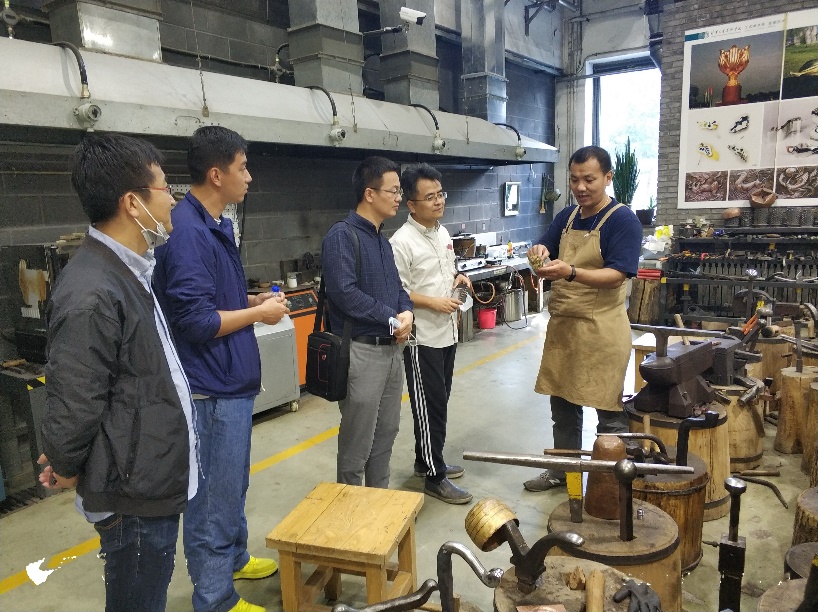 在美术学院艺术与设计实验教学中心的参观过程中,领航工作站成员、美术学院雕塑系青年教师罗幻,华体会娱乐平台艺术与设计实验教学中心主任助理郑林庆详细介绍了金属工艺、陶瓷艺术与设计、纤维工艺、玻璃工艺、雕塑艺术等几个实验室的建设发展情况,相关实验室负责人讲解了实验室艺术特色以及支撑学院教学科研工作情况。大家一边参观实验室中陈列的艺术作品,一边了解近几年美术学院在相关专业技术教学科研平台发展建设过程中取得的显著成绩,也欣赏了美术学院近年来承担的国家及地方重大艺术设计项目。