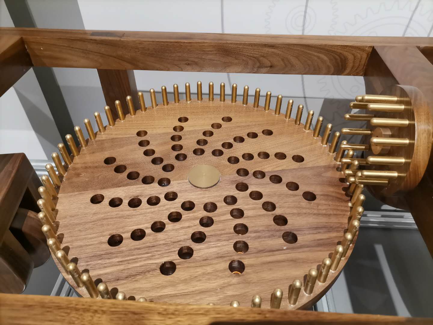王哲然说,复原工作讲求精细,部分材料在加工时,只能半机械操作,细节上的打磨全部需要手工进行。“记得我们在木盘上打孔时,为保证圆孔半径误差不超过0.05mm,研发成员亲自手工打磨。而且每次木盘上完底漆和胶水,还要再一次进行校准,只有这样才能保证复原出来的机械结构牢固和精准。”