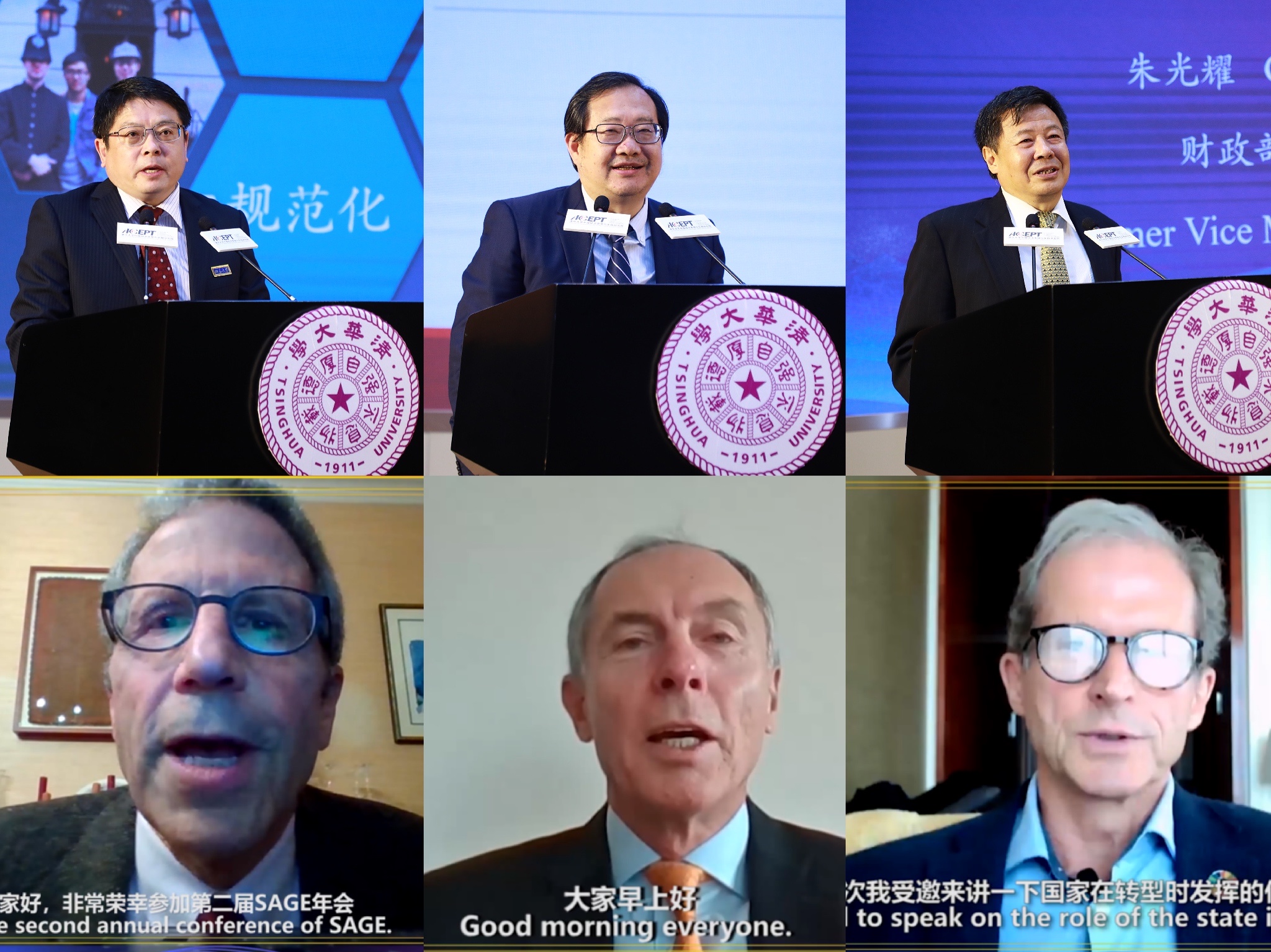 董志勇、刘守英、朱光耀、马斯金、扬·什韦纳尔、伯格洛夫(从左至右,从上至下)发言