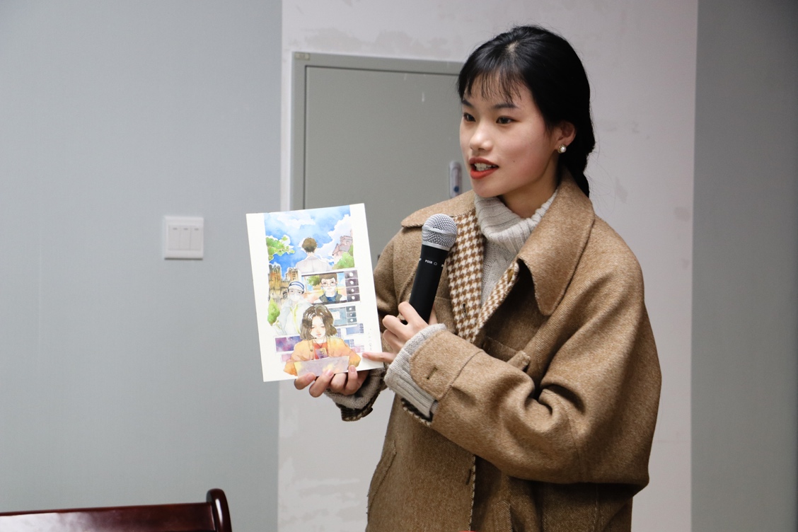 在自由交流环节中,支部同学积极发言讲述了各自的抗疫记忆。才红展示了自己为此次支部活动创作的手绘作品,并将这幅记录了同学们云端同窗回忆的底稿赠送给陈旭留念。