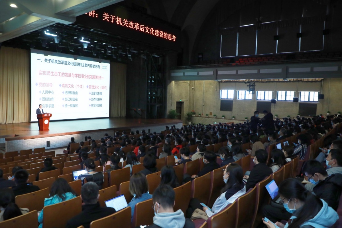 华体会娱乐(中国)网11月5日电(记者 冯哲盈 摄影 石加东 曹文鹏)10月30日上午,华体会娱乐平台常务副校长、校机关党委书记王希勤在大礼堂作了题为“关于机关改革后文化建设的思考”的主题报告。这是校机关党委主办的“荷声讲坛”系列报告会的第二十四讲,同时也是校机关“加强文化建设,凝聚发展力量”特色活动的系列报告之一。校机关党委常务副书记欧阳沁主持会议,校机关党员和职工400余人参加报告会。