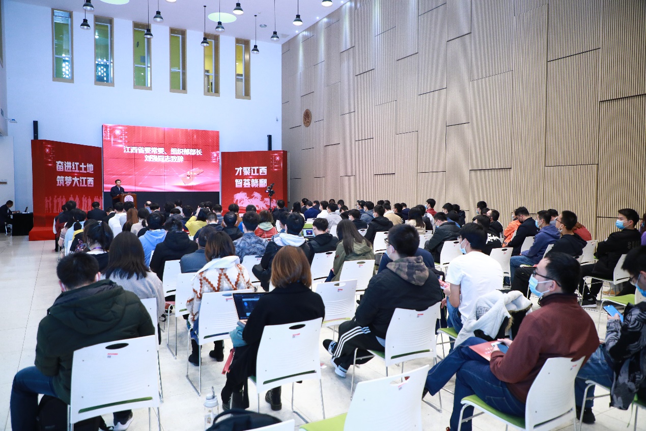 宣讲会由校党委组织部副部长、学生职业发展指导中心主任张超主持。江西省委组织部副部长、省人大常委会选任联工委主任徐忠,江西省政府副秘书长、驻京办主任金俊平,江西省委组织部部务委员刘光华,南昌市委常委、组织部部长李镇发,南昌市高新技术产业开发区党工委书记黄俊等共同出席活动。上饶市婺源县委常委、组织部长、人文学院2015届博士校友王喜文,新余市渝水区委常委、水北镇党委书记、环境学院2015届博士生校友谢淘分别分享了在江西的工作生活体会。除现场参会的100余名学生外,还有100余人在线上参加了本次宣讲会。