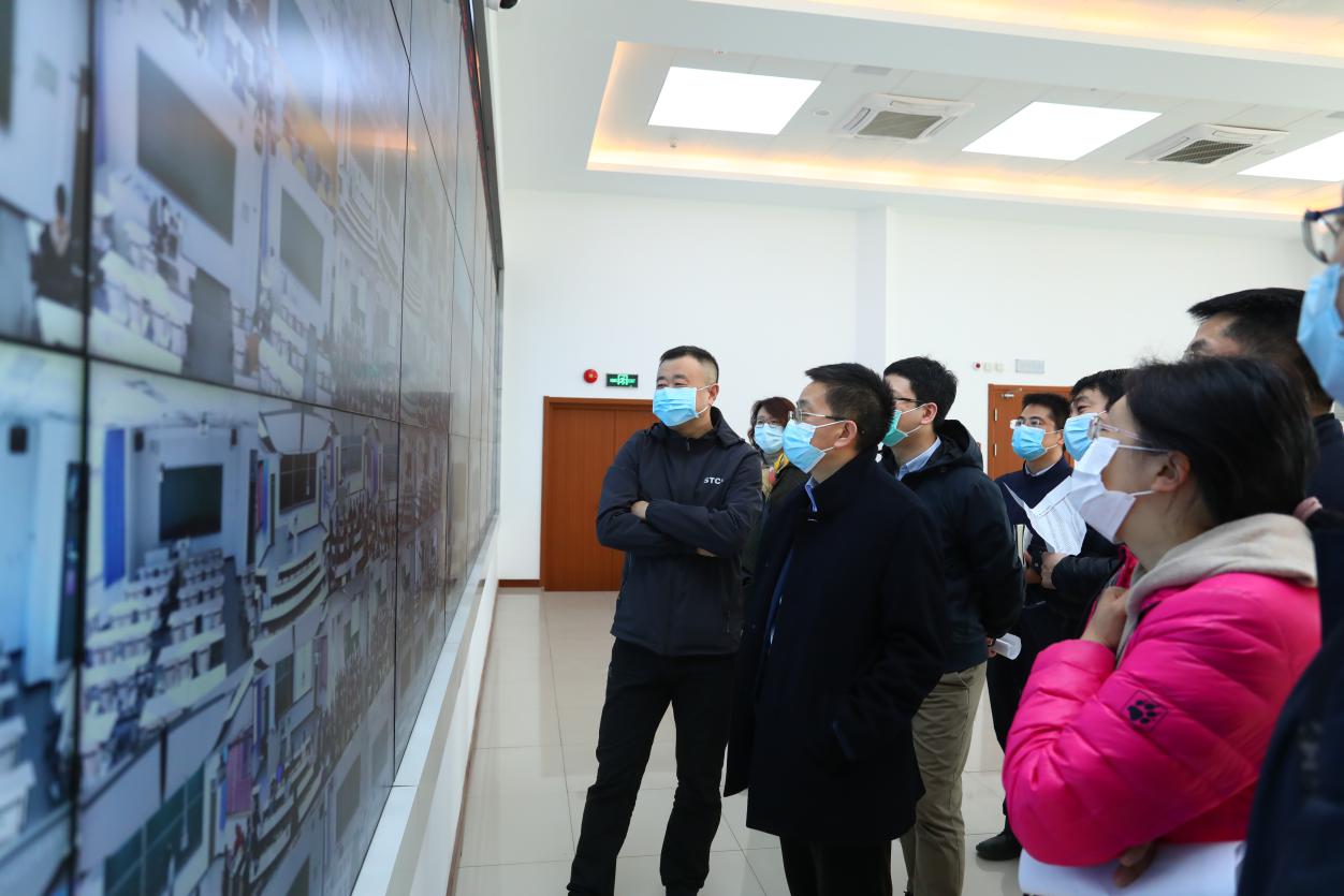 随后,杨斌一行和彭刚一行来到位于六教六层的教学指挥中心,大家站在大屏幕前,仔细查看各教室疫情防控情况、认真查看了课堂中教师讲课和学生听课的精神状态,了解了本学期线上线下融合式教学技术支持团队的技术保障情况等。