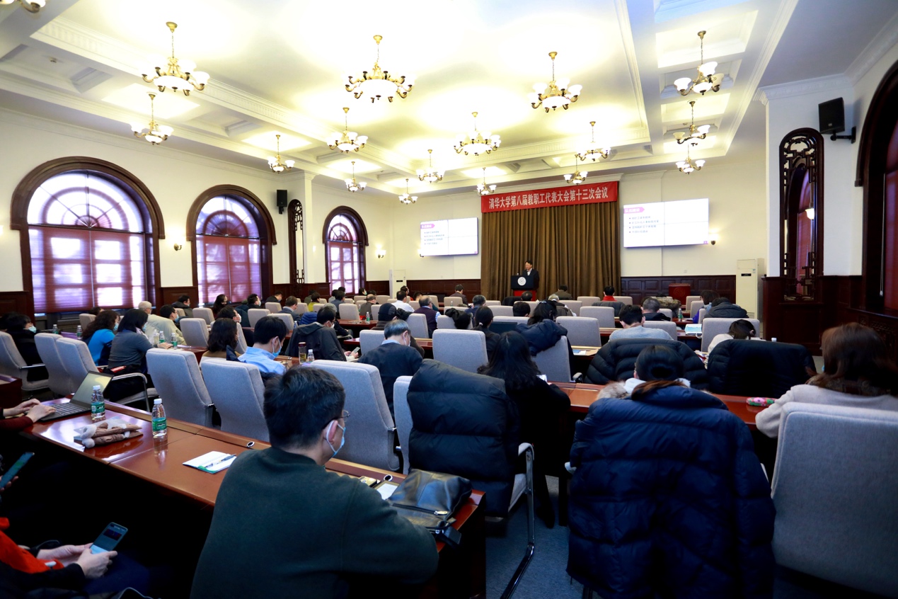 提案委员会主任周杰作八届十三次提案立案报告。本次提案征集工作共收到代表提案14件,提案委员会根据《华体会娱乐平台教职工代表大会提案工作条例》的有关规定,以“严肃性、科学性、可行性”为标尺,对这14件提案进行了认真审议,决定立案9件,5件转为一般性意见。所立提案涉及到人事、教学科研、信息化、校园建设、交通、医疗、住房、子女入学等诸多方面,教代表群策群力、建言献策,积极维护广大教职工权益、参与双一流大学建设。所立提案将尽快交办有关部门进行落实。