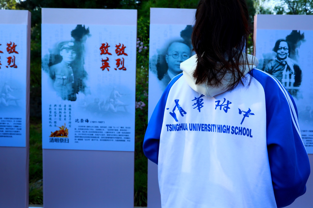 在通往英烈碑的小路上,校研究生会设置了清华英烈和卫国戍边烈士专题展览,展示了英烈的生平事迹,并在活动现场发放了《清华英烈谱》。